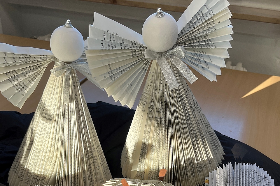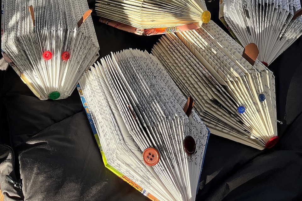 Die Schülerinnen und Schüler der Upcycling-AG falteten diese Woche aus alten Büchern kleine Igel und Engel.