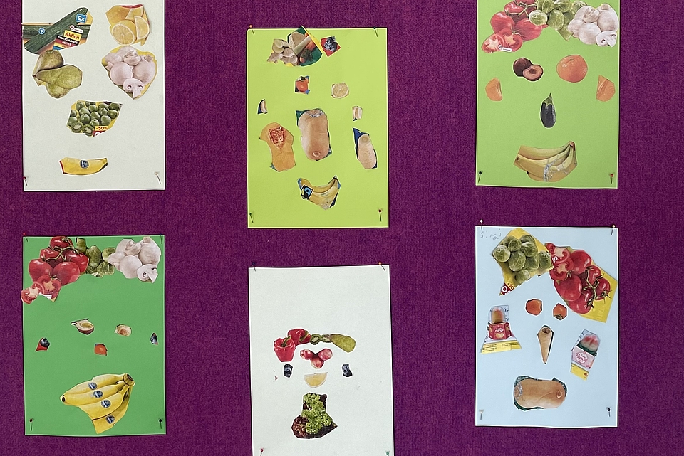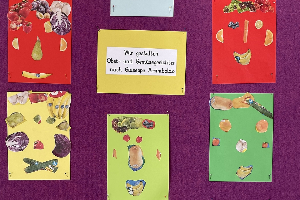 Die Klasse 2a hat sich in HSU mit dem Thema Gesunde Ernährung beschäftigt. Zum Abschluss der Einheit gestaltete die Klasse Obst- und Gemüsegesichter nach Giuseppe Arcimboldo.